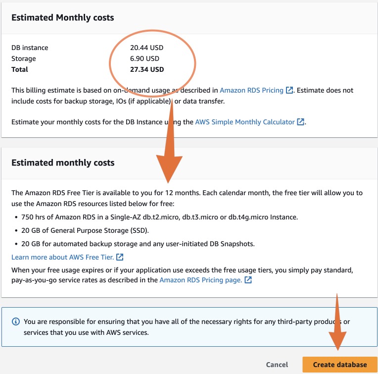 Estimated Monthly costs ตรงนี้ไม่ต้องตกใจ เพราะเราใช้ Free Tier ต่อไปให้กดปุ่ม Create database