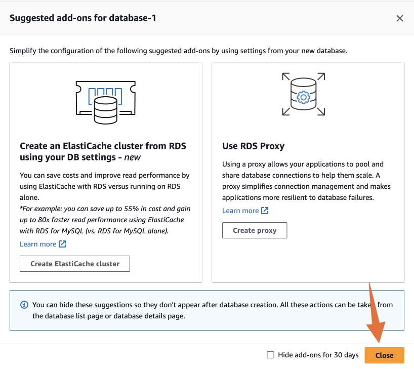 ถ้ามี Pop up ขึ้นมาถามว่าต้องการสร้าง RDS Proxy หรือไม่ ให้ปิดได้เลยครับ