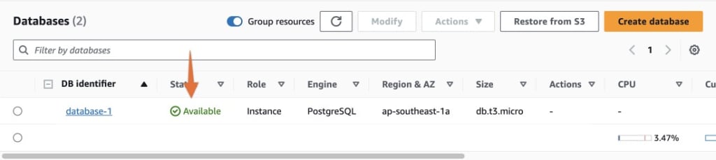 เมื่อ AWS RDS สร้างฐานข้อมูลให้เราเสร็จแล้ว ฐานข้อมูลจะขึ้น Status Available