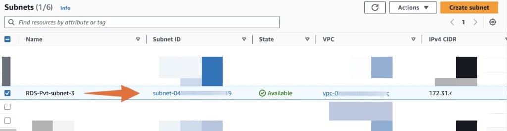 เมื่อเข้ามาที่หน้าจอถัดไป ให้ดูว่าเลข IP ที่จดไว้ตรงกับ IPv4 CIDR บรรทัดไหน คลิ๊กตรง subnet-xxxxx ในคอลัมน์ Subnet ID